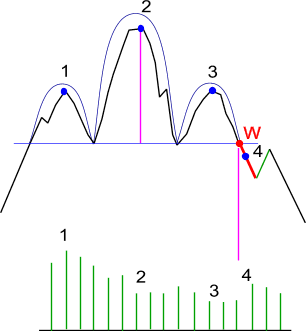 - Wielkość obrotów w trakcie kształtowania głowy powinna być mniejsza niż w trakcie kształtowania lewego ramienia. Takie zachowanie obrotów to pierwszy sygnał słabnięcia trendu wzrostowego.